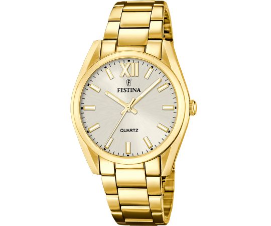 Il bracciale in Acciaio inossidabile di alta qualità - colore: Oro - con Fibbia pieghevole vi darà un ulteriore piacere con il vostro nuovo orologio Festina. Il bracciale in Acciaio inossidabile offre un elevato livello di comfort e può essere indossato fino a una circonferenza massima del polso di 190 mm.