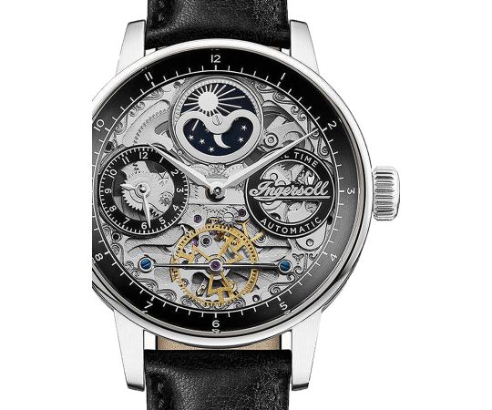 automatico che, come di consueto per gli orologi Ingersoll, garantisce un cronometraggio preciso e offre le seguenti funzioni: Min, Fase lunare, Ora, Secondo fuso orario.
