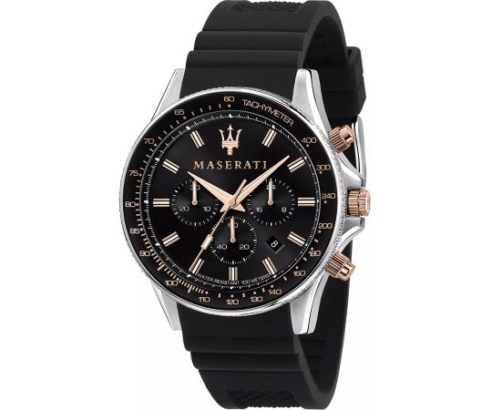 batteria (quarzo) che, come di consueto per gli orologi Maserati, garantisce un cronometraggio preciso e offre le seguenti funzioni: 24 ore, Cronografo, Data, Min, Sec, Ora.