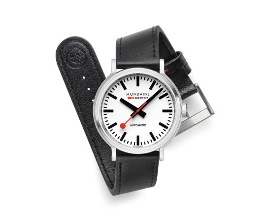 Il bracciale in pelle vegan di alta qualità - colore: Nero - con Fibbia vi darà un ulteriore piacere con il vostro nuovo orologio Mondaine. Il bracciale in pelle vegan offre un elevato livello di comfort e può essere indossato fino a una circonferenza massima del polso di 200 mm.