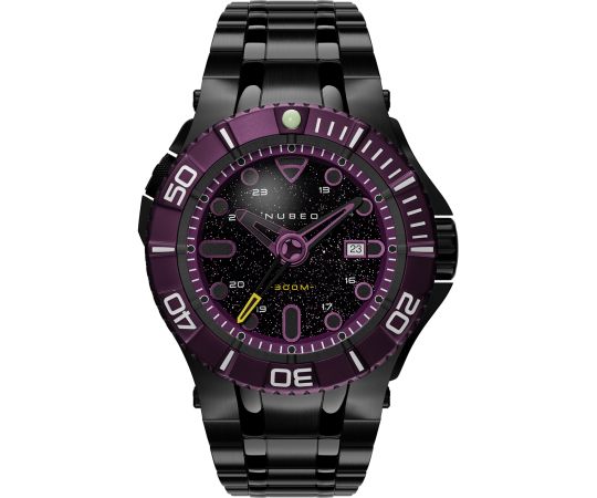 automatico che, come di consueto per gli orologi Nubeo, garantisce un cronometraggio preciso e offre le seguenti funzioni: Ora, Min, Sec, Data, Valvola ad elio.