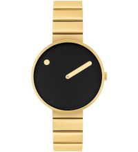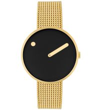 Picto® mette in discussione l'idea di un orologio classico con due lancette e un quadrante con numeri. Qui l'ora è indicata da un punto sul quadrante girevole, mentre i minuti sono indicati da una lancetta tradizionale. |  |