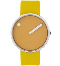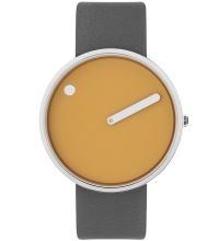 Picto® mette in discussione l'idea di un orologio classico con due lancette e un quadrante con numeri. Qui l'ora è indicata da un punto sul quadrante girevole, mentre i minuti sono indicati da una lancetta tradizionale. |  |