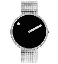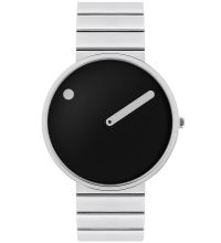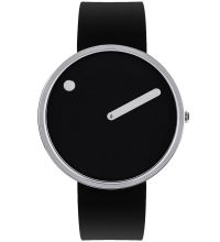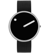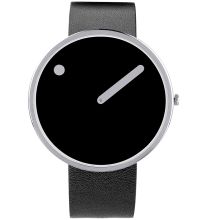 Picto® mette in discussione l'idea di un orologio classico con due lancette e un quadrante con numeri. Qui l'ora è indicata da un punto sul quadrante girevole, mentre i minuti sono indicati da una lancetta tradizionale. |  |