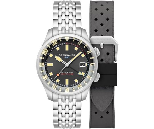 automatico che, come di consueto per gli orologi Spinnaker, garantisce un cronometraggio preciso e offre le seguenti funzioni: Ora, Min, Sec, Data, GMT, Secondo fuso orario.
