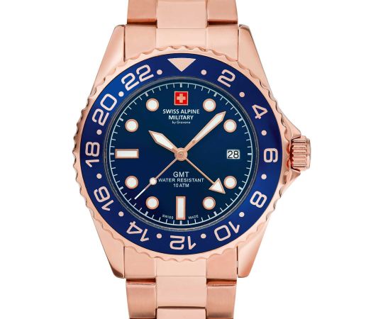 batteria (quarzo) che, come di consueto per gli orologi Swiss Alpine Military, garantisce un cronometraggio preciso e offre le seguenti funzioni: Data, GMT, Min, Sec, Ora, Secondo fuso orario.