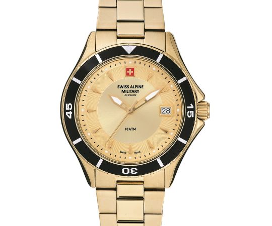 Il temperato, Vetro minerale offre un'ampia protezione contro graffi e danni accidentali. Sotto, il quadrante del vostro nuovo orologio da sogno è Oro. L'illuminazione del segnatempo Swiss Alpine Military 7740.1111 è arricchita da Indici illuminati, Mani luminose, che ne facilitano la lettura anche in condizioni di scarsa illuminazione.