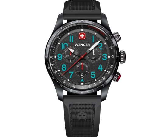 Swiss Made batteria (quarzo) che, come di consueto per gli orologi Wenger, garantisce un cronometraggio preciso e offre le seguenti funzioni: Ora, Min, Sec, Data, Cronografo.